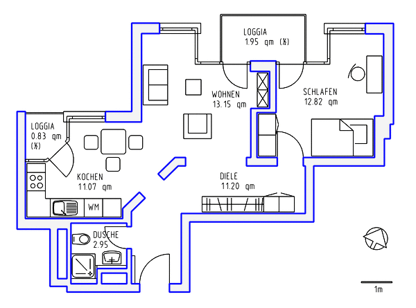 2 Zimmer, Küche, Dusche, 2 Loggien, Aufzug, Tiefgarage, 1. OG